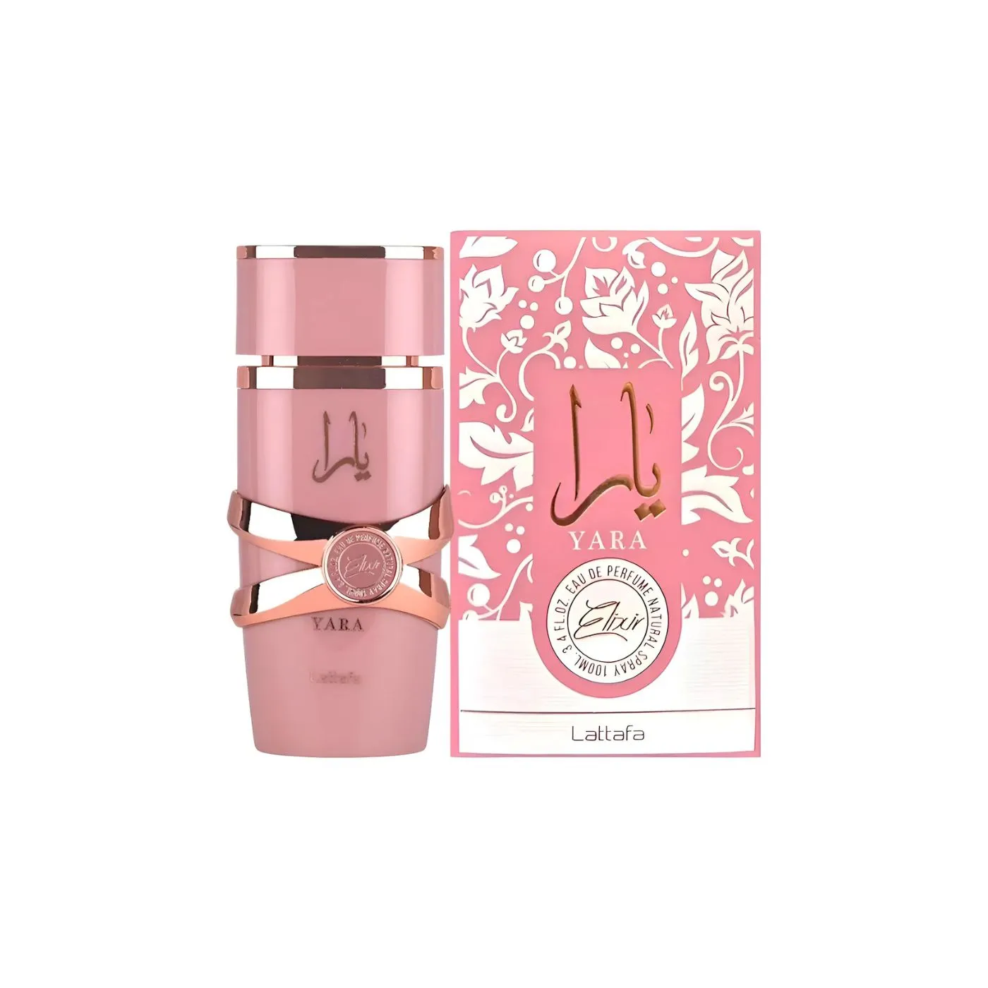 Lattafa Yara Elixir EDP es una fragancia oriental vainilla, dulce y gourmand, con notas de salida de fresa y grosella negra, un corazón floral de jazmín y azahar, y un fondo cálido de vainilla, caramelo, ámbar y almizcle, creando un aroma seductor y envolvente que recuerda a postres, ideal para mujeres que buscan una estela inolvidable y sofisticada. Huele a galleta arcoiris.